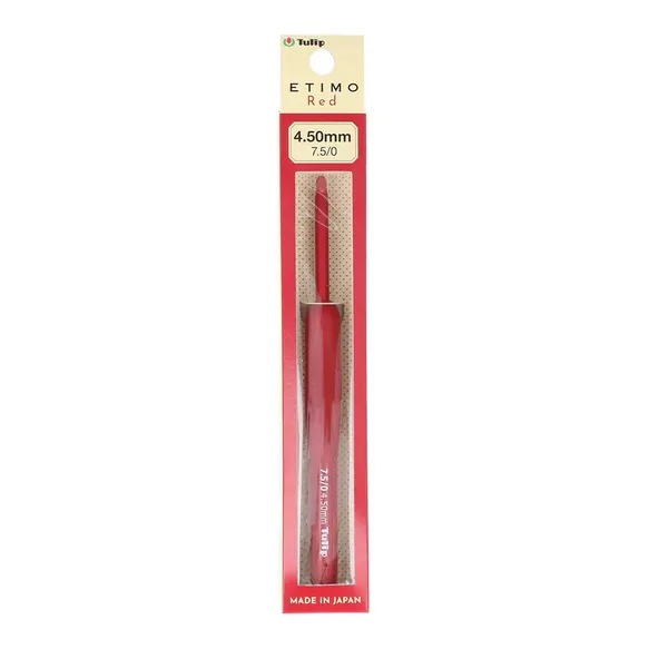 De prachtige Etimo Red aluminium haaknaalden van Tulip zorgen dankzij de comfortabele zachte softgrip handgreep voor urenlang haakplezier zonder vermoeide handen.