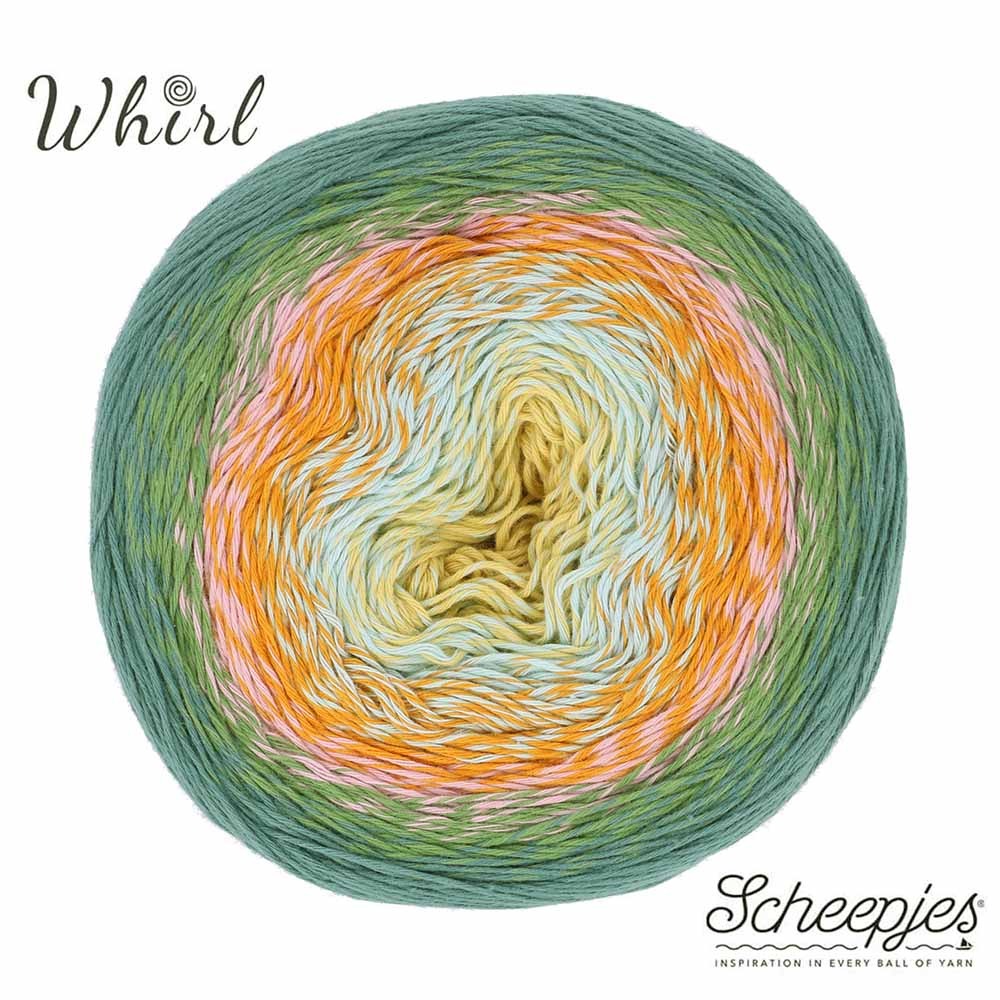 Scheepjes Cotton Whirl is het perfecte garen voor brei- en haakliefhebbers die graag met natuurlijke materialen werken. Deze nieuwe toevoeging aan de Whirl-collectie is gemaakt van 100% biologisch katoen en is niet alleen luxueus zacht en ademend, maar ook duurzaam en milieuvriendelijk geproduceerd. De yarn cakes met een indrukwekkende lengte van 1000 meter hebben prachtige lange en vloeiende kleurwisselingen. Vooral kant-achtig haak- en breiwerk komt erg mooi uit in Cotton Whirl, waardoor het garen bij uitstek geschikt is voor sjaals, omslagdoeken en dekens, stijlvolle (woon)accessoires en luchtige zomerkleding.